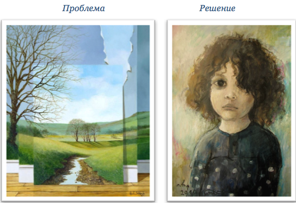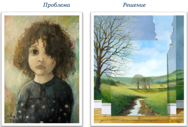 В этом упражнении мы посмотрим, на самом ли деле в нашей жизни все так однозначно. Посмотрите на картинку. Сначала работаем с верхним рядом. Как вы уже поняли первая картинка означает проблему, вторая решение. Попробуйте описать эту ситуацию, глядя на верхние картинки.