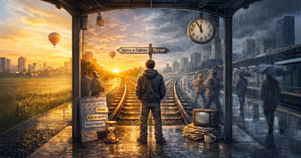 Он делает привычные вещи, думает привычные мысли, откладывает то, что действительно важно, и всё чаще живёт идеей «когда‑нибудь потом». При этом даже не возникает сильного внутреннего протеста, потому что всё выглядит достаточно приемлемо, чтобы не менять.